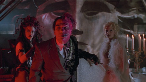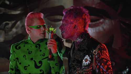 Batman faces off against two foes: the schizophrenic, horribly scarred former District Attorney Harvey Dent, aka Two-Face, and the Riddler, a disgruntled ex-Wayne Enterprises inventor seeking revenge against his former employer by unleashing his brain-sucking weapon on Gotham City's residents. As the caped crusader also copes with tortured memories of his parents' murder, he has a new romance, with psychologist Chase Meridian.